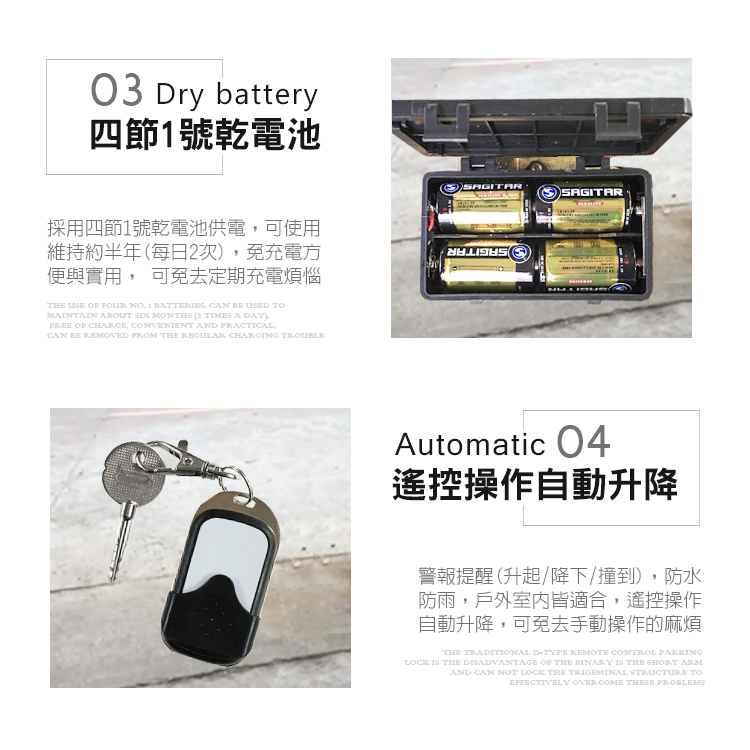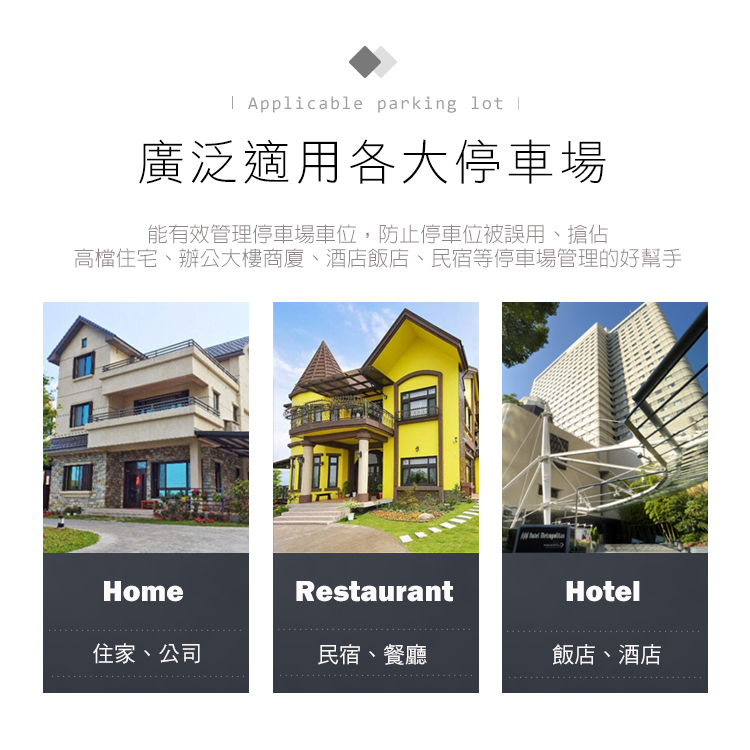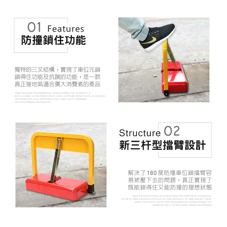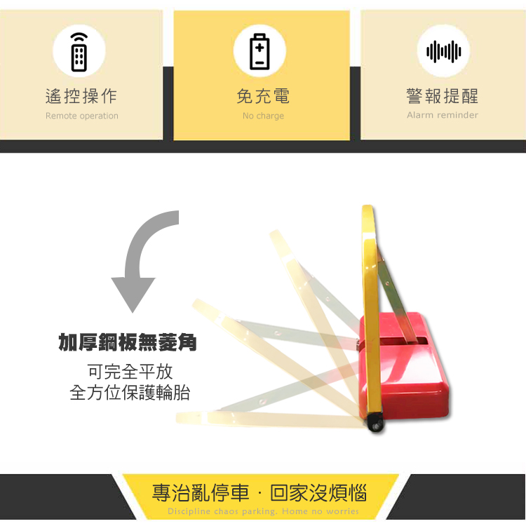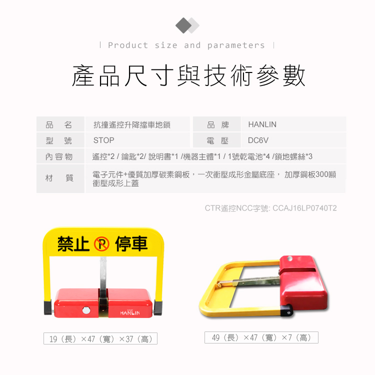 HANLIN-STOP 抗撞遙控升降擋車地鎖 獨特的三叉結構,實現了車位元鎖鎖得住功能及抗踹的功能,是一款真正接地氣的適合廣大消費者的產品。 HANLIN遙控車位鎖具有外形美觀大方、結構新穎、維護方便、功能強大、安全可靠、 使用壽命長等特點,能有效管理停車場車位,防止停車位被誤用、搶佔,是高檔住宅、商廈、酒店、飯店等停車場管理的好幫手。 新三杆型擋臂設計,鎖得住才是硬道理!解決了180度防撞車位鎖擋臂容易被壓下去的問題,真正實現了既能鎖得住又能防撞的理想狀態。性能穩定,鎖死+防撞+報警+抗壓+防水+免充電,就是好用! 產品特點: 1.防撞/抗撞/抗踹/防壓超級耐用! 2.警報提醒(升起/降下/撞到) 3.防水防雨 戶外室內皆適合 4.可替換電池,可使用維持約半年(每日2次) 5.真正有效避免私人用地被亂停車! 6.採用4節1號乾電池供電,免充電,方便實用免去定期充電煩惱。 7.遙控操作自動升降! 免手動操作! |